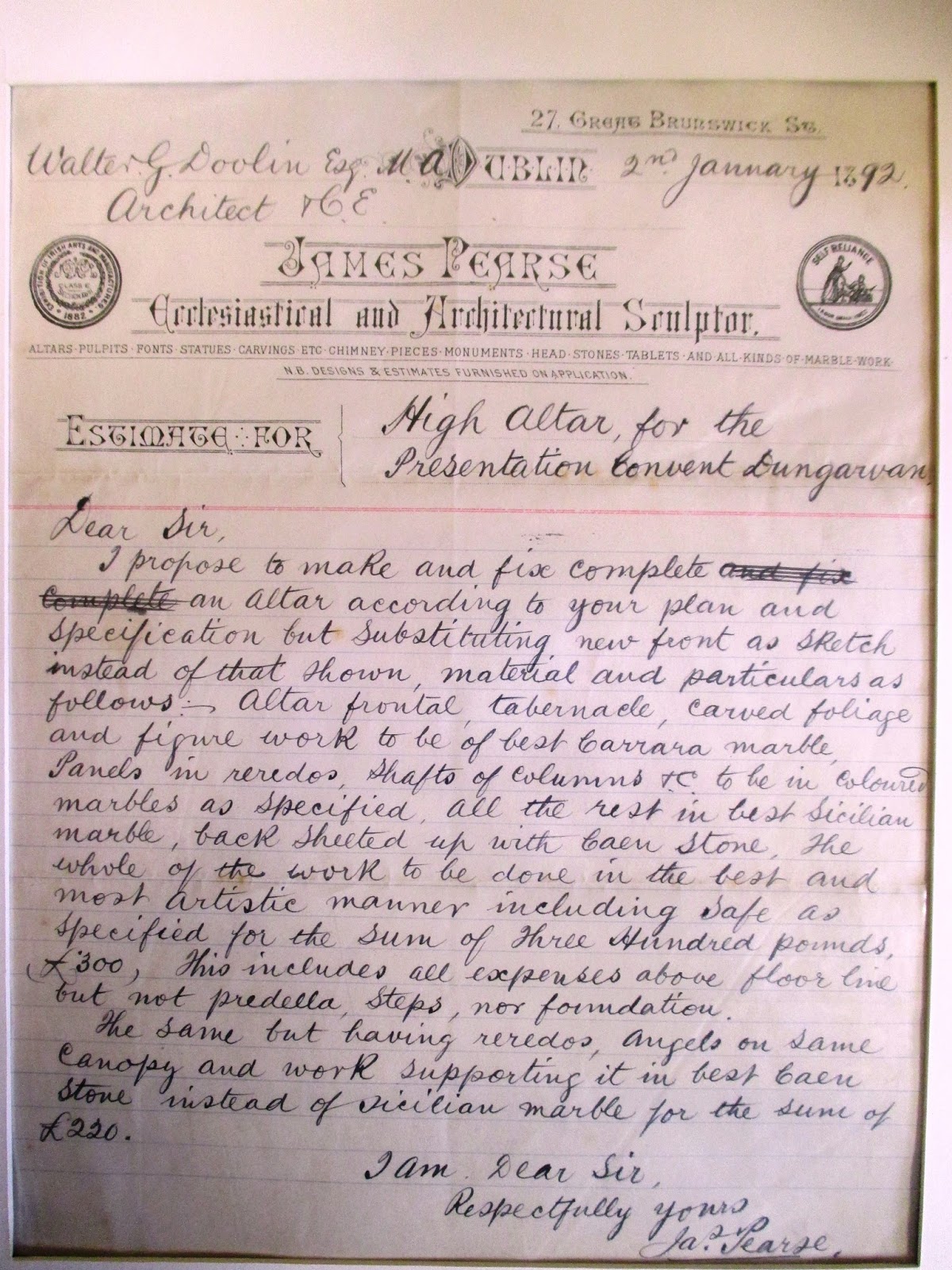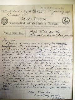 Also on display is an estimate for a new altar at the chapel of the Presentation Convent, Dungarvan from James Pearse (father of Padráig Pearse) kindly donated by the Presentation sisters.