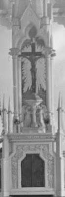 The paper went on to describe the altar surrounds: the tabernacle, which from the slab of the altar will rise to the imposing height of 18 feet and a half. At its base will be placed the tabernacle itself, to be ornamental of wrought iron, and adorned with marble and enamel. Above, the figures of two angels will be carved, before a tazza of marble, intended for a monstrance for the exposition of the Blessed Sacrament.
